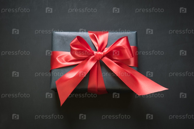 Подарочная коробка в черной бумаге с красной лентой