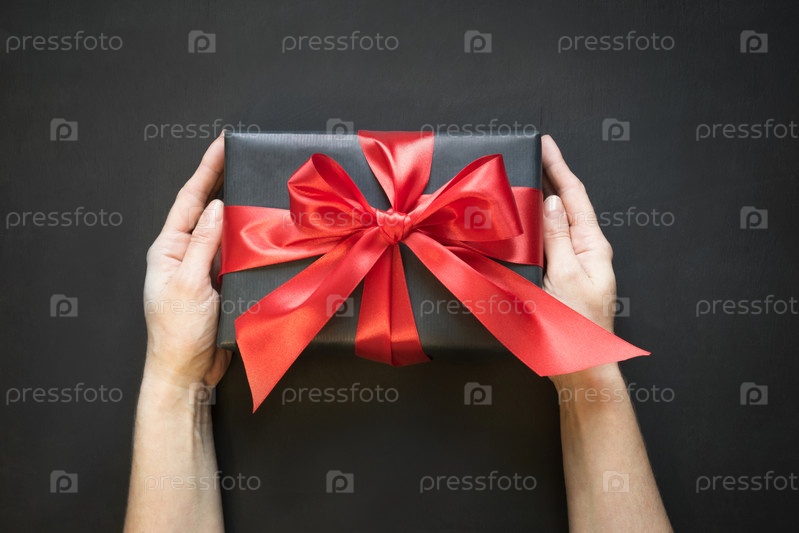 Подарочная коробка обернута в черной бумаге с красной лентой