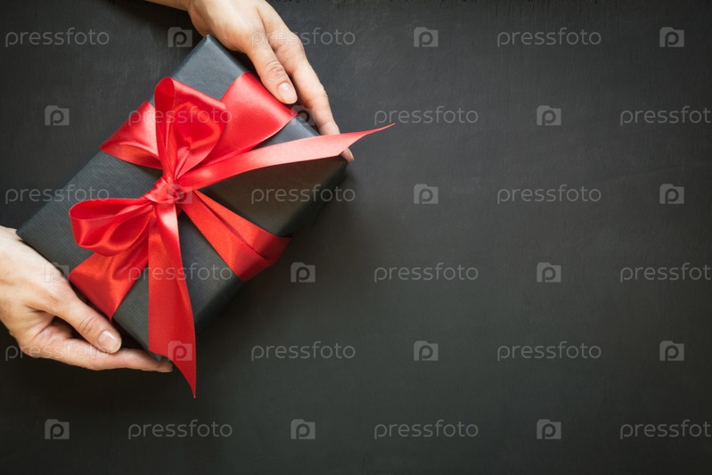 Подарочная коробка в черной бумаге с красной лентой