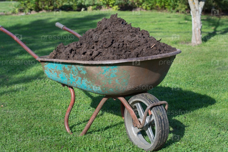 Садовая тачка с почвой на ферме