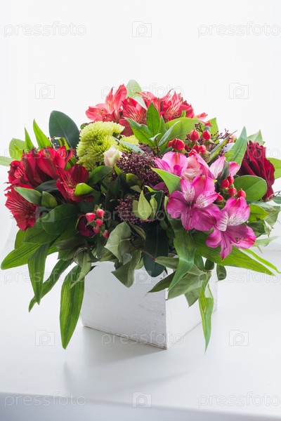 Красивый букет из красных роз и альстромерий в вазоне
