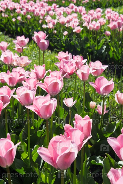 Розовые тюльпаны с зелеными листьями