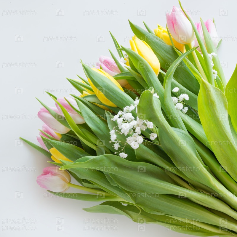 Красивый букет из розовых и желтых тюльпанов на белом фоне