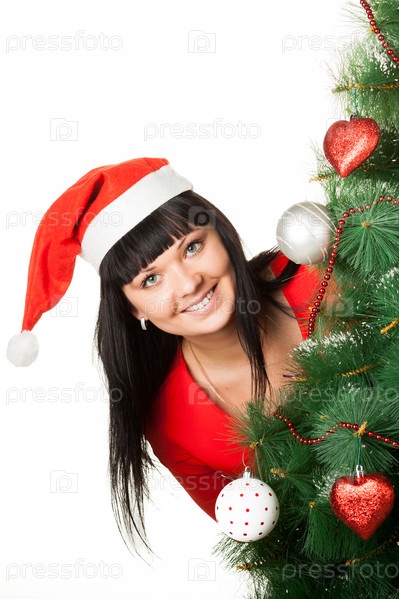 Девушка в красном колпаке Санта-Клауса выглядывает из-за новогодней елки