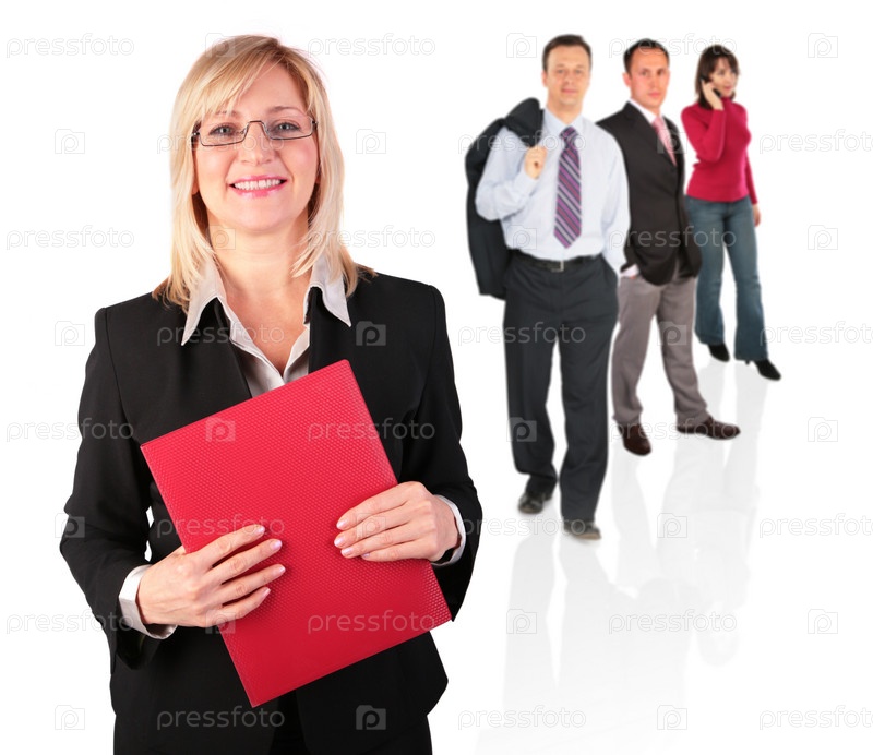 Бизнес-леди и ее команда на белом фоне