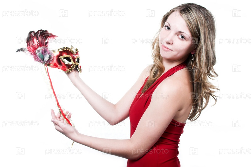 Улыбающаяся девушка с красной карнавальной маской