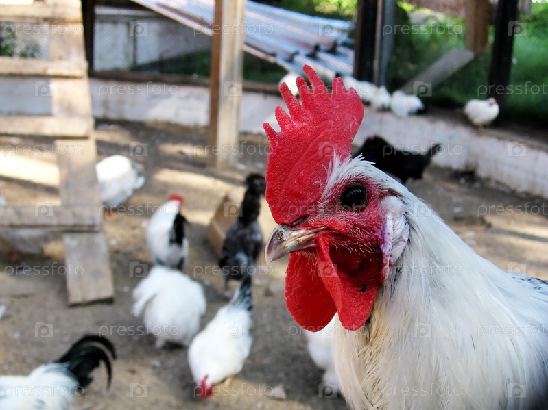 Белый петух с красным гребнем на ферме