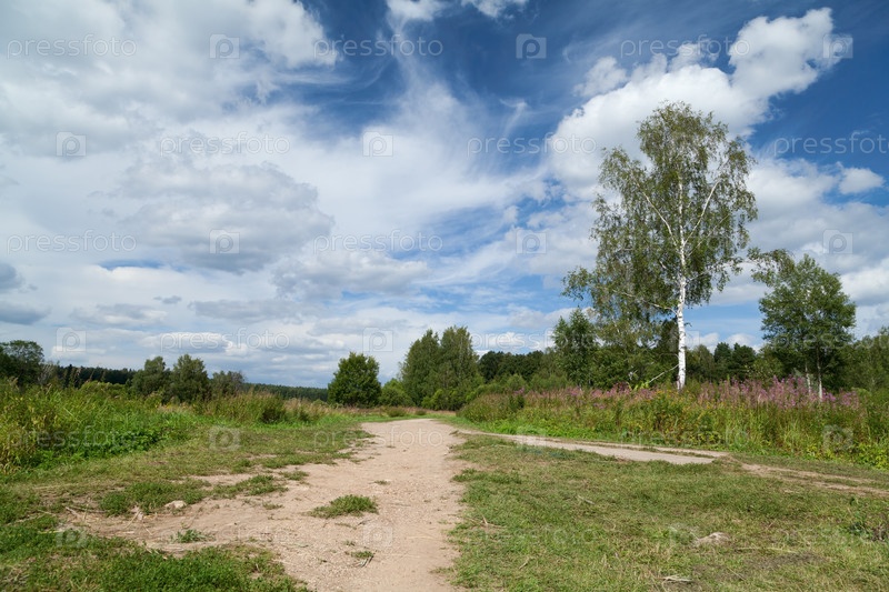 Русский сельский пейзаж с грунтовой дорогой