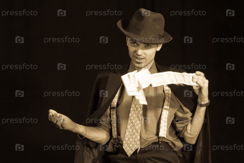 Мужчина тасует колоду карт, сепия
