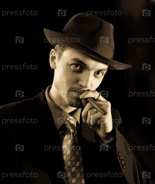 Старомодный молодой человек с сигарой, сепия