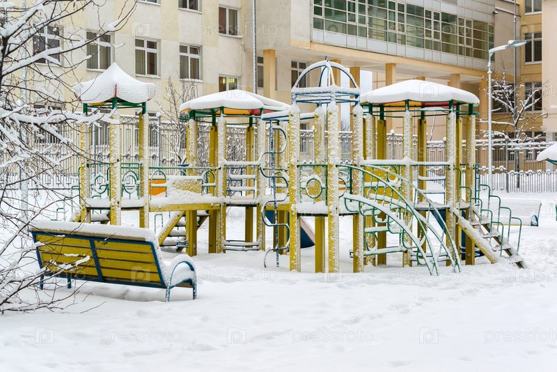 Детский игровой комплекс и скамейки в снегу