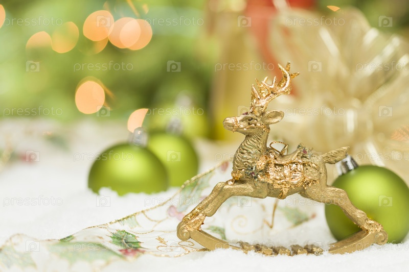 Золотой олень на снегу у рождественских украшений