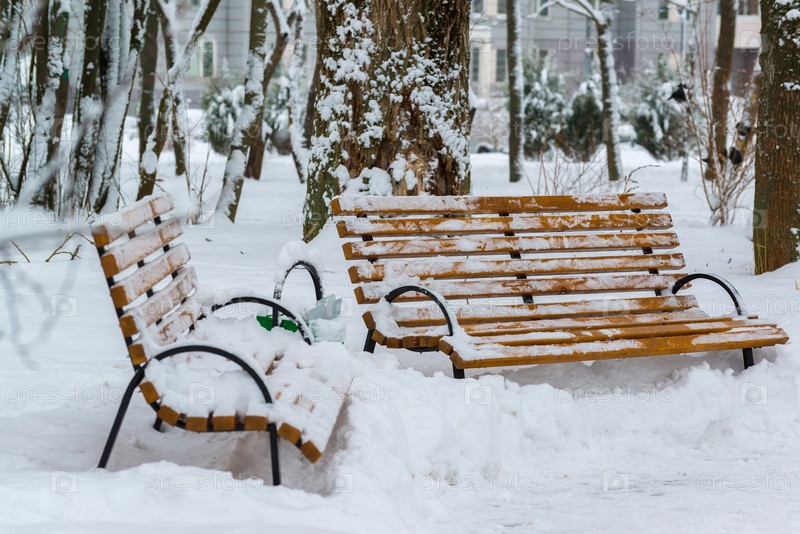 Две скамейки в парке после снегопада