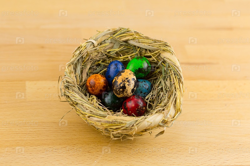 Крашеные яйца в маленьком плетеном гнезде