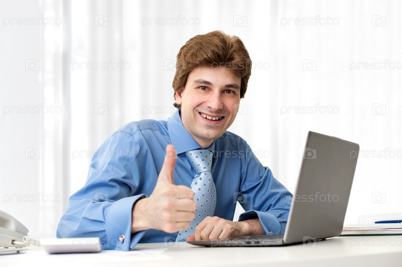 Бизнесмен с ноутбуком сидит за столом в офисе