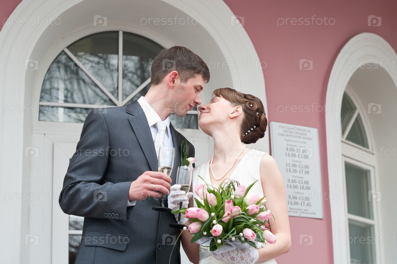 Молодые новобрачные с букетом цветов и шампанским целуются у загса