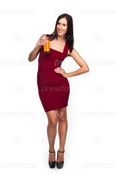 Красивая молодая женщина в красном вечернем платье со стаканом сока
