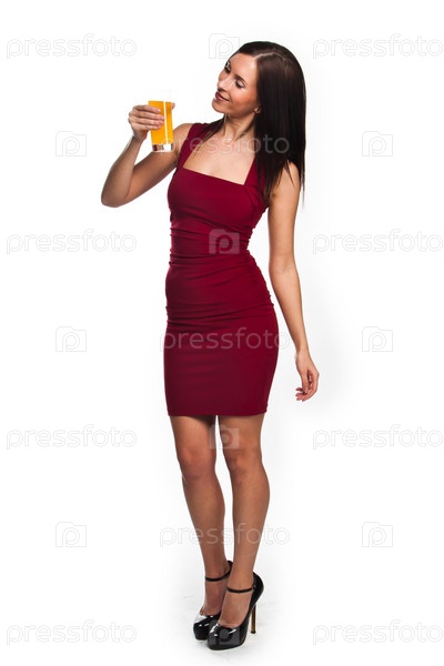 Красивая молодая женщина в красном вечернем платье со стаканом сока