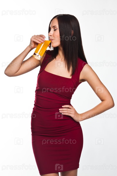 Красивая молодая женщина в красном вечернем платье со стаканом сока