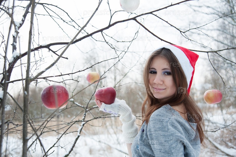 Девушка с яблоками в лесу
