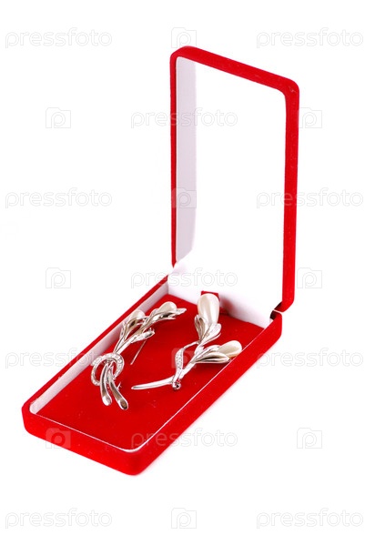 Красная коробочка с ювелирным украшением в виде броши серебристого цвета