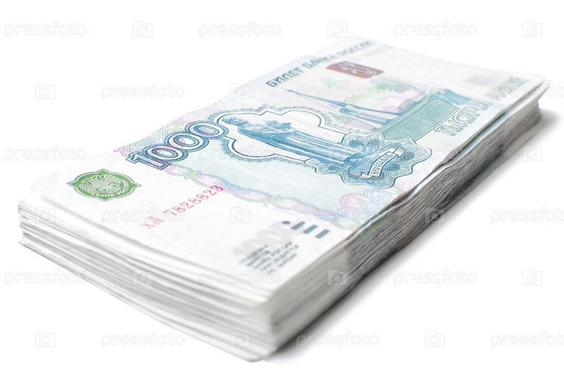 Стопка купюр по тысяче рублей на белом фоне
