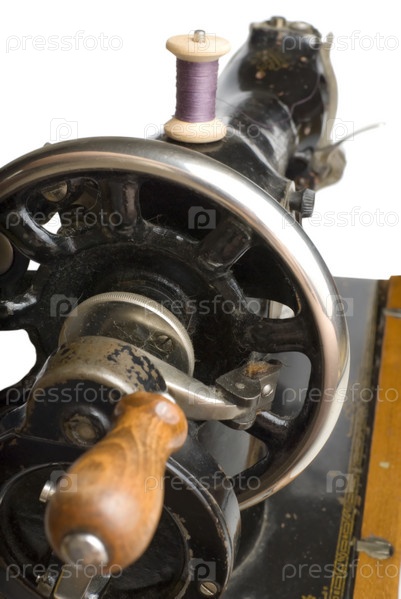 Старая советская швейная машина крупным планом на белом фоне