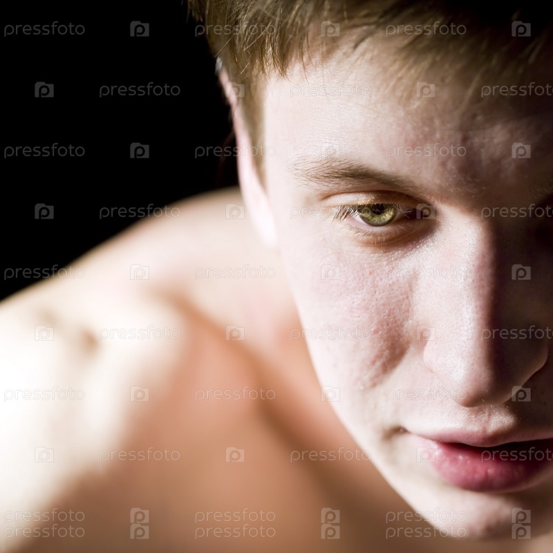 Лицо задумчивого мужчины крупным планом на черном фоне