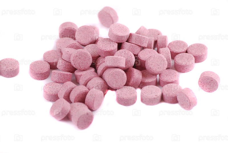 Горсть розовых таблеток на белом фоне