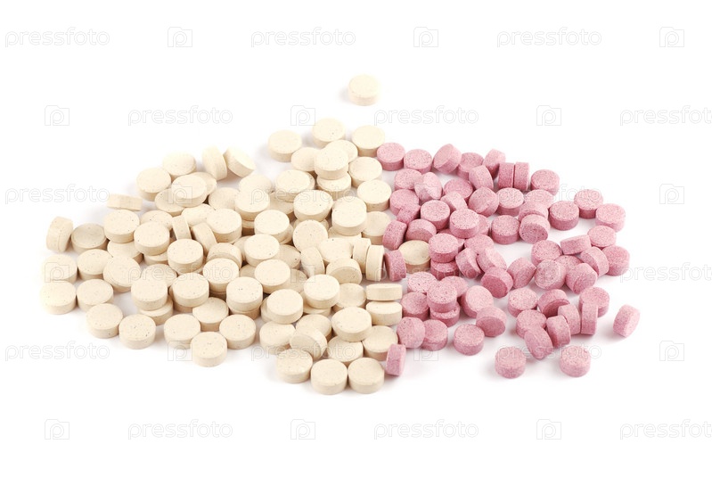 Горсть таблеток двух цветов на белом фоне