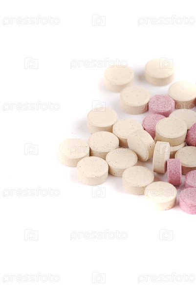 Горсть таблеток двух цветов на белом фоне