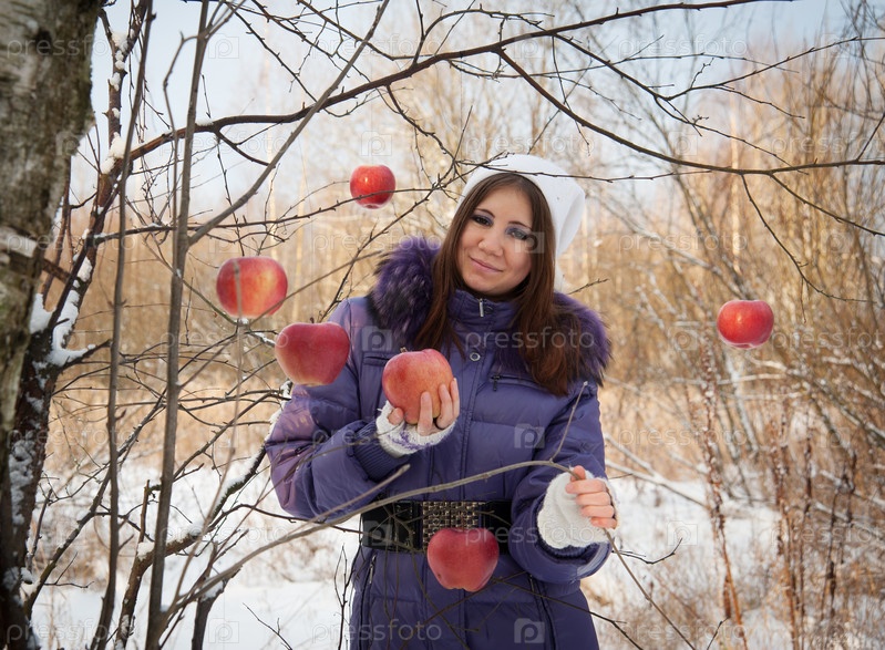 Девушка с яблоками в лесу
