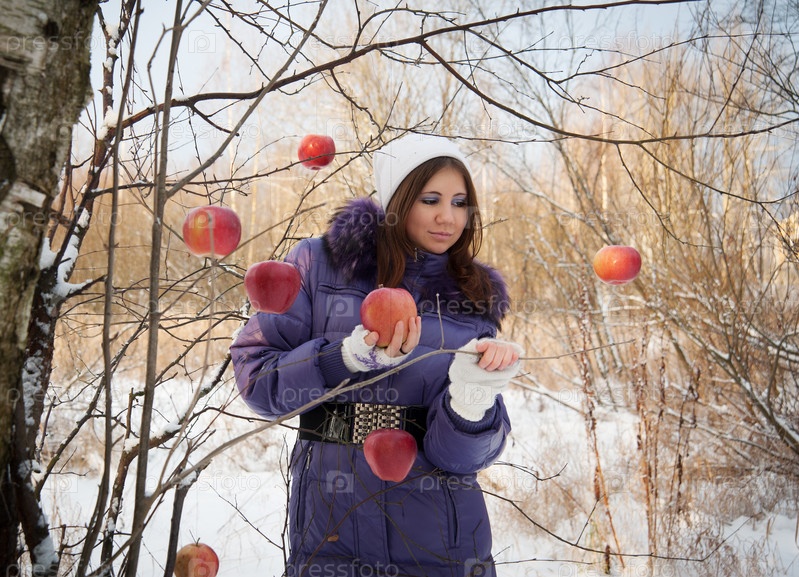 Девушка с яблоками в лесу