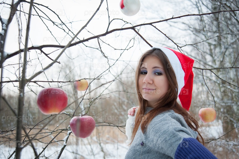 Девушка с яблоками в лесу