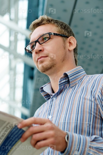 Юридическая персона, в рубашке и очках с газетой