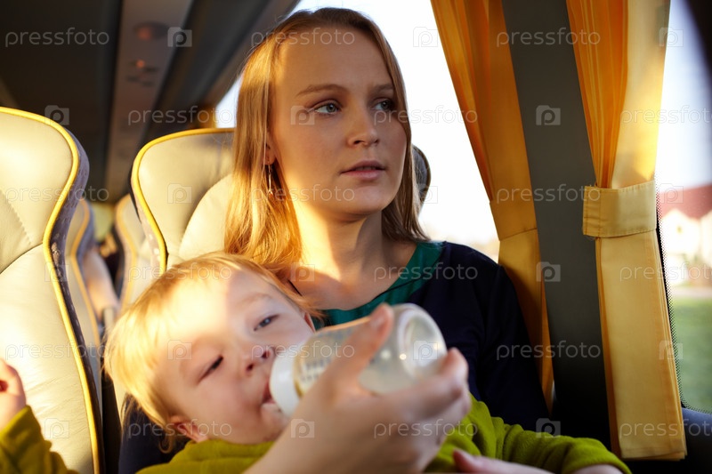 Мать кормит своего малыша в автобусе