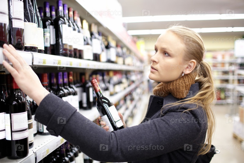 Молодая женщина выбирает вино в супермаркете