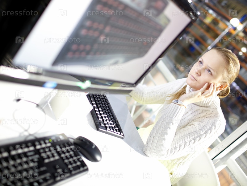 Молодая девушка выбирает клавиатуру в интернете