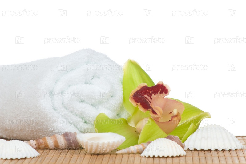 Орхидея, ракушка и белое полотенце
