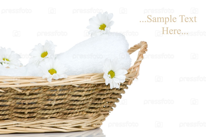 Цветы ромашки и полотенце в корзинке на белом фоне