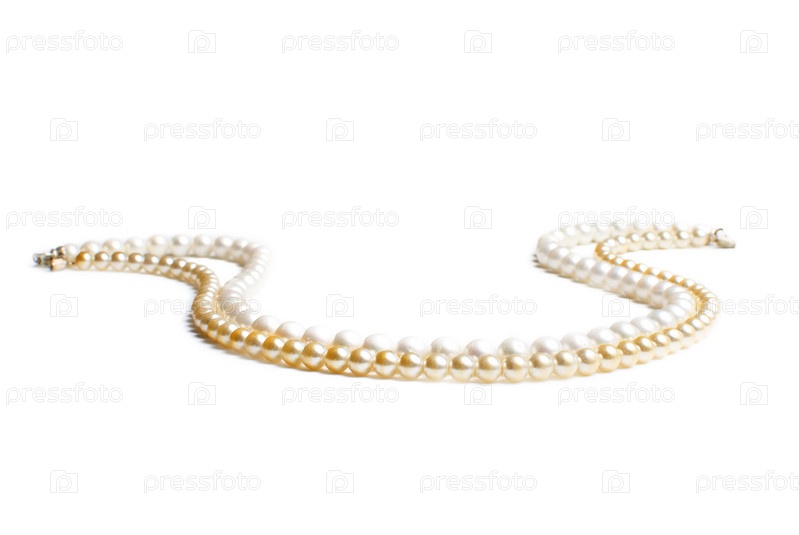 Ожерелье из золотых и белых бусин жемчуга на белом фоне