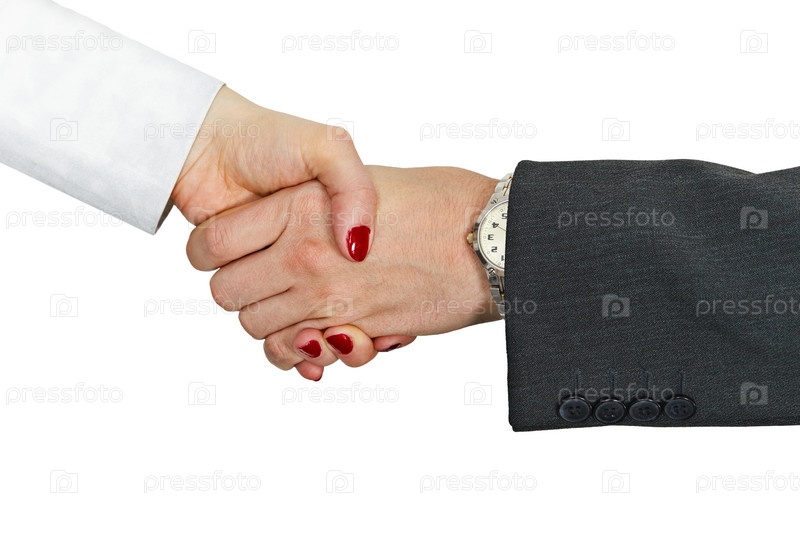 Рукопожатие мужчины и женщины, на белом фоне