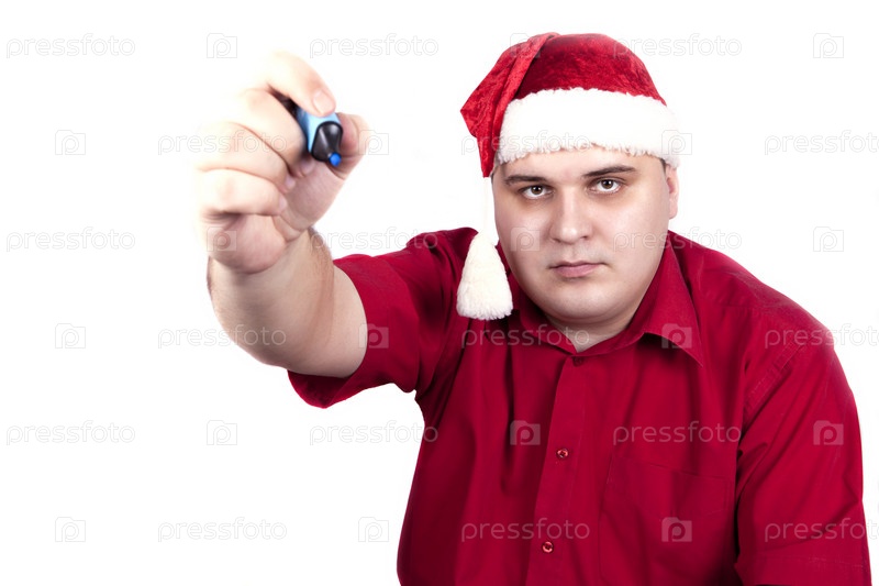 Молодой человек в красной рубашке и шапке Санта-Клауса