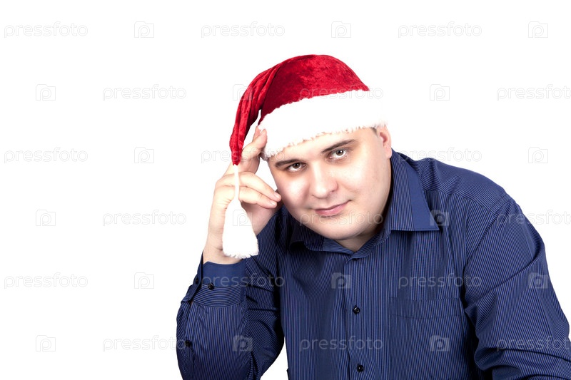 Молодой человек в красной рубашке и шапке Санта-Клауса