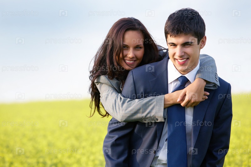 Пара молодых счастливых людей в деловой одежде на солнечной лужайке