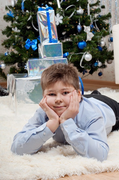 Мальчик с подарками возле елки