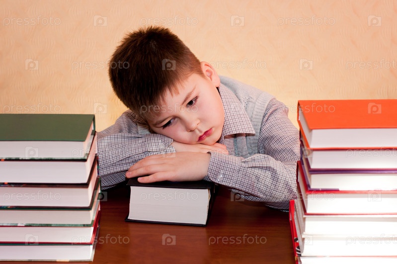 Усталый мальчик со стопкой книг