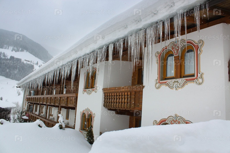 Коттедж, покрытый снегом и сосульками