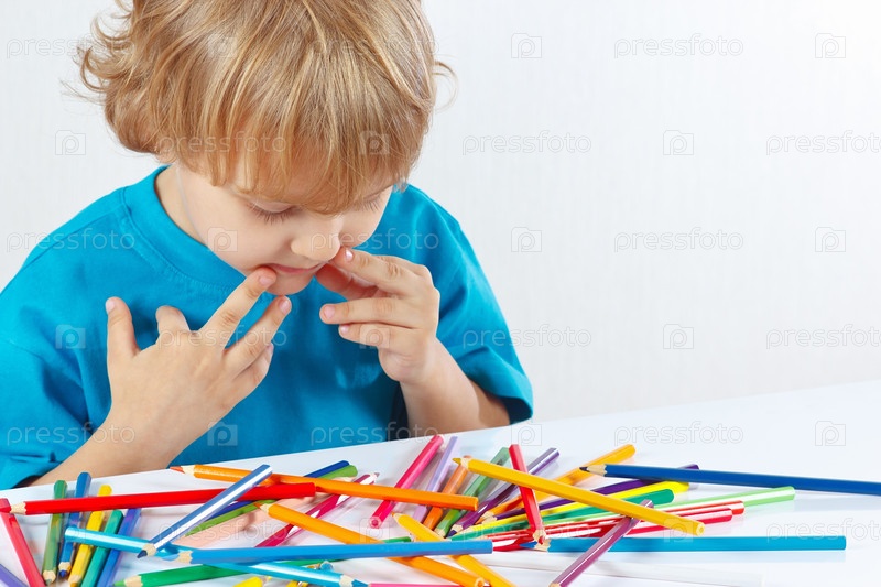 Маленький мальчик за столом с цветными карандашами на белом фоне
