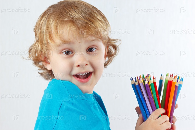 Маленький мальчик за столом с цветными карандашами на белом фоне